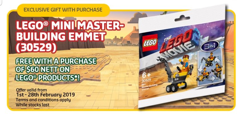 FREE LEGO Mini-Master Building Emmet Polybag with minimum S$60 purchase on LEGO products.