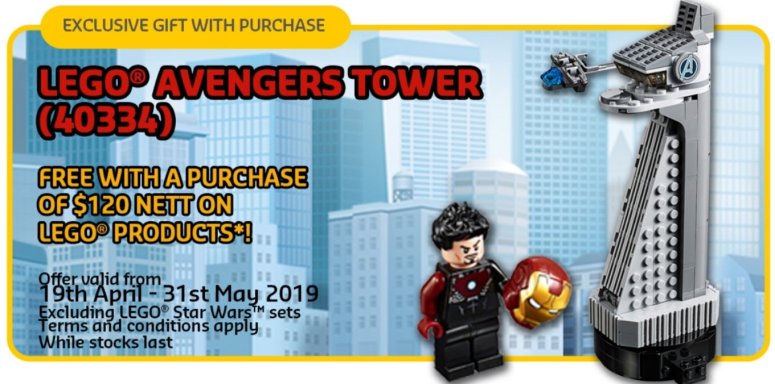 Get your FREE LEGO 40334 Avengers Tower polybag with minimum purchase of $120 from 19 April – 31 May while stocks last.