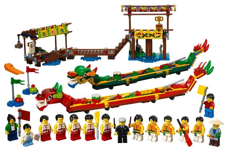 The latest in the series will allow fans to recreate all the color and thrills of a Dragon Boat Festival and features two impressive dragon boats (one green and one red). Each boat features a dragon head with an opening mouth and posable tail, three minifigure seats for the paddlers, space for the helmsman and drummer to stand, plus small wheels underneath for racing.